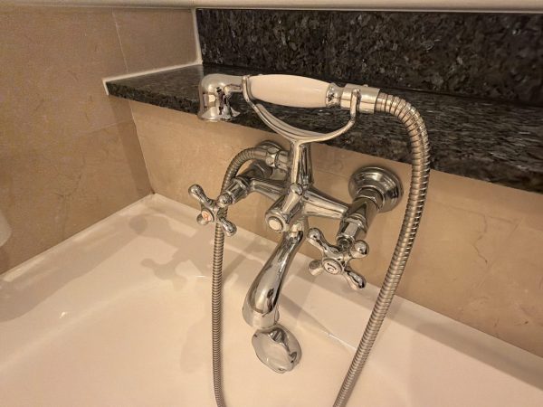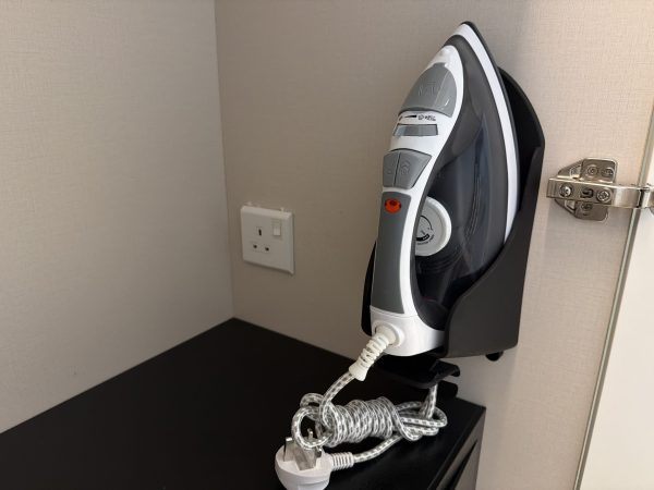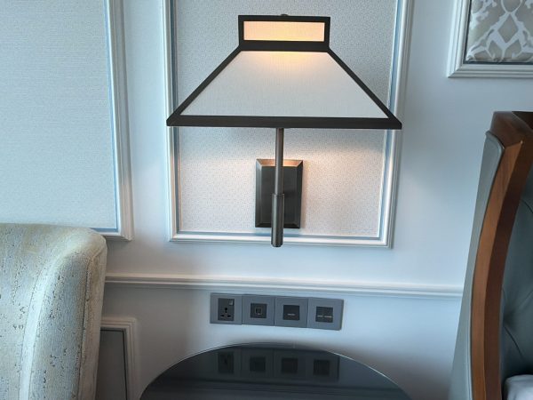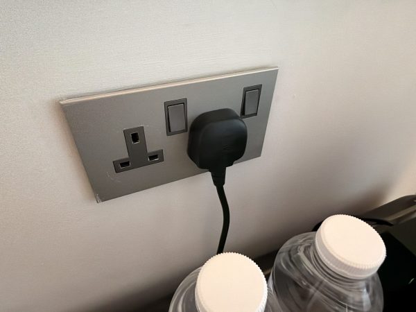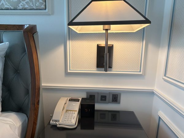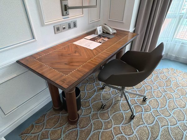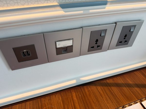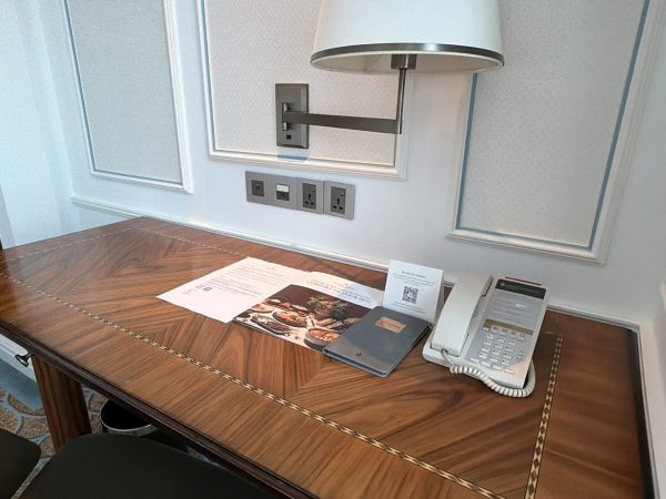 設備面では、バスタブ付きで、電源も部屋の各所にあり不便は感じません。デスクも広めで、日本のプラグが使えるコンセントが2口、USBポートもデスク周りとベッドサイドにあり、充実しています。