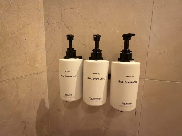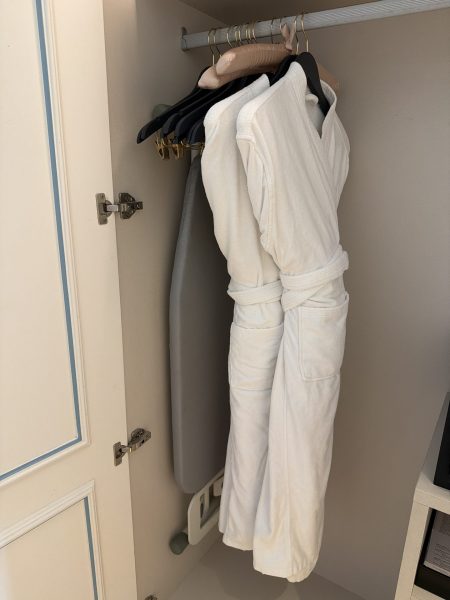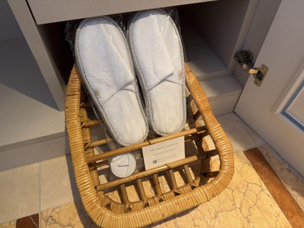 備品は歯ブラシ、スリッパ、ボトルウォーター、バスローブなど一通り揃っています。