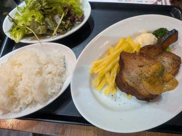 お肉料理は中華風チャーシュー、お魚料理は鯛のチリソースでした。今日はお肉を選択。